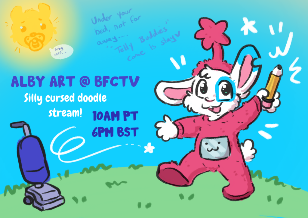 This page is for attendees of the VBFC convention! As part of the show I will be doing an art stream with a silly little doodles of your character as a ‘Telly Buddy’ which is a totally cute and not-at-all bootleg little character in a fluffy onesie!